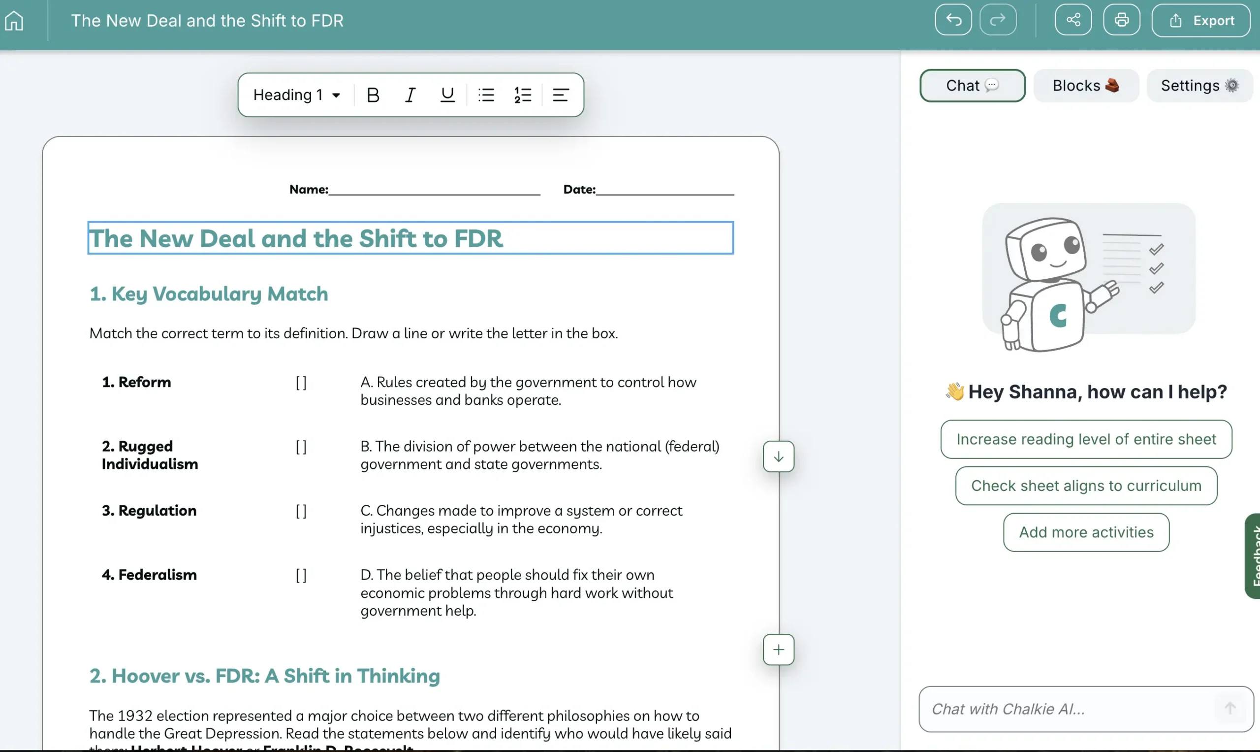 This might be one of the most practical features. If you need a printable practice page, review sheet, or station task, Chalkie can create it and pair it with your lesson content.